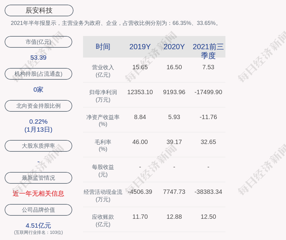 2021年半年报显示,辰安科技的主营业务为政府、企业,占营收比例分别为:66.35%、33.65%。