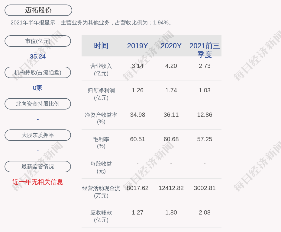 2021年半年报显示,迈拓股份的主营业务为其他业务,占营收比例为:1.94%。