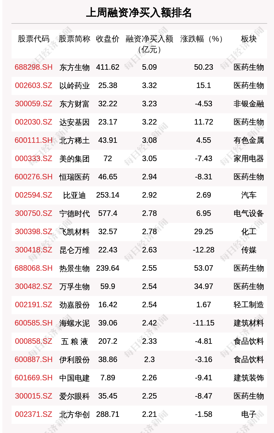 上周两市共有933只个股有融资资金净买入,共有0只个股净买入金额超10亿元,其中东方生物、以岭药业、东方财富排名前三,买入金额分别为5.09亿元、3.32亿元、3.23亿元。