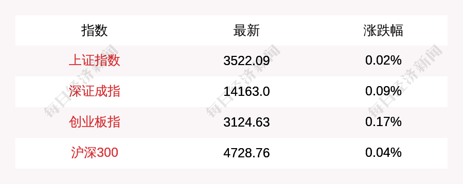 每经AI快讯:北京时间1月17日9:30,上证指数开盘上涨0.83点,涨幅为0.02%,报3522.09点;深证成指开盘上涨12.43点,涨幅为0.09%,报14163.0点;创业板指开盘上涨5.22点,涨幅为0.17%,报3124.63点;沪深300开盘上涨2.03点,涨幅为0.04%,报4728.76点。