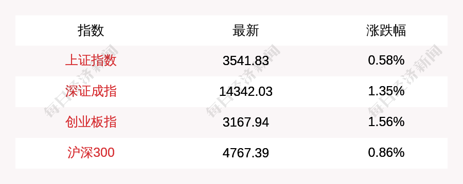 每经AI快讯:北京时间1月17日11:30,上证指数早盘上涨20.57点,涨幅为0.58%,报收3541.83点,成交额2786.28亿元;深证成指上涨191.46点,涨幅为1.35%,报收14342.03点,成交额4410.32亿元;创业板指上涨48.53点,涨幅为1.56%,报收3167.94点,成交额1999.67亿元;沪深300上涨40.66点,涨幅为0.86%,报收4767.39点,成交额1665.86亿元。
