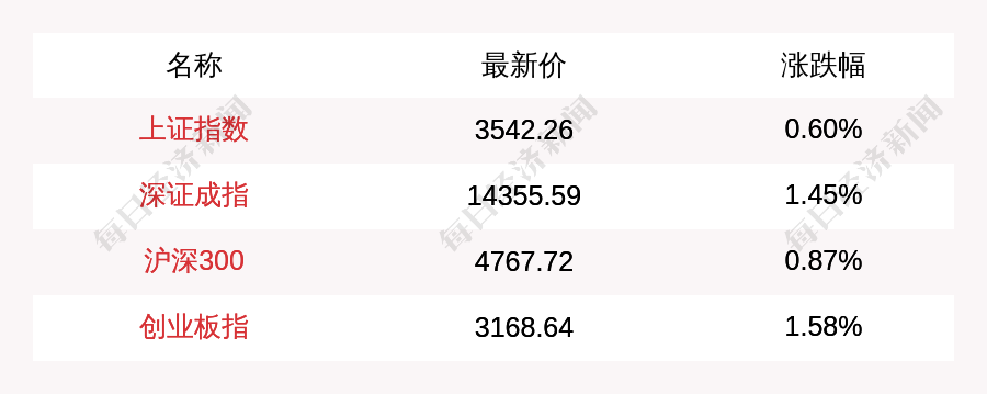 截至北京时间13:30,上证指数报3542.26点,涨0.60%,深证成指报14355.59点,涨1.45%,沪深300报4767.72点,涨0.87%,创业板指报3168.64点,涨1.58%