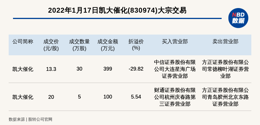 每经讯,2022年1月17日,新三板创新层公司凯大催化(830974)发生2笔大宗交易,总成交金额为499万元,成交金额最高的一笔成交价13.3元/股,成交数量30万股,成交金额399万元,折价29.82%。买入营业部是中信证券股份有限公司大连星海广场证券营业部,卖出营业部是方正证券股份有限公司常德柳叶湖证券营业部。