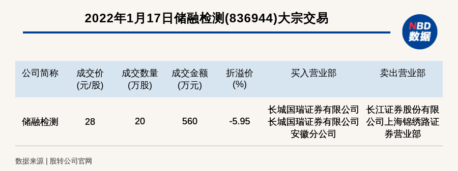 每经讯,2022年1月17日,新三板基础层公司储融检测(836944)发生一笔大宗交易,成交价28元/股,成交数量20万股,成交金额560万元,折价5.95%。买入营业部是长城国瑞证券有限公司长城国瑞证券有限公司安徽分公司,卖出营业部是长江证券股份有限公司上海锦绣路证券营业部。
