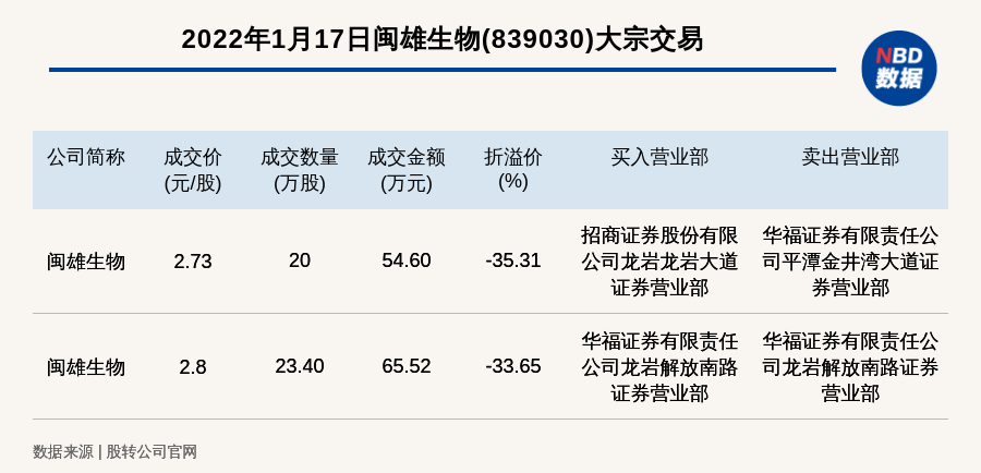 每经讯,2022年1月17日,新三板创新层公司闽雄生物(839030)发生2笔大宗交易,折价率最高的一笔成交价2.73元/股,成交数量20万股,成交金额54.60万元,折价35.31%。买入营业部是招商证券股份有限公司龙岩龙岩大道证券营业部,卖出营业部是华福证券有限责任公司平潭金井湾大道证券营业部。
