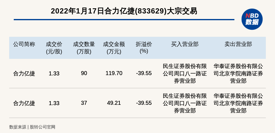 每经讯,2022年1月17日,新三板创新层公司合力亿捷(833629)发生2笔大宗交易,总成交金额为168.91万元,成交金额最高的一笔成交价1.33元/股,成交数量90万股,成交金额119.70万元,折价39.55%。买入营业部是民生证券股份有限公司周口八一路证券营业部,卖出营业部是华泰证券股份有限公司北京学院南路证券营业部。