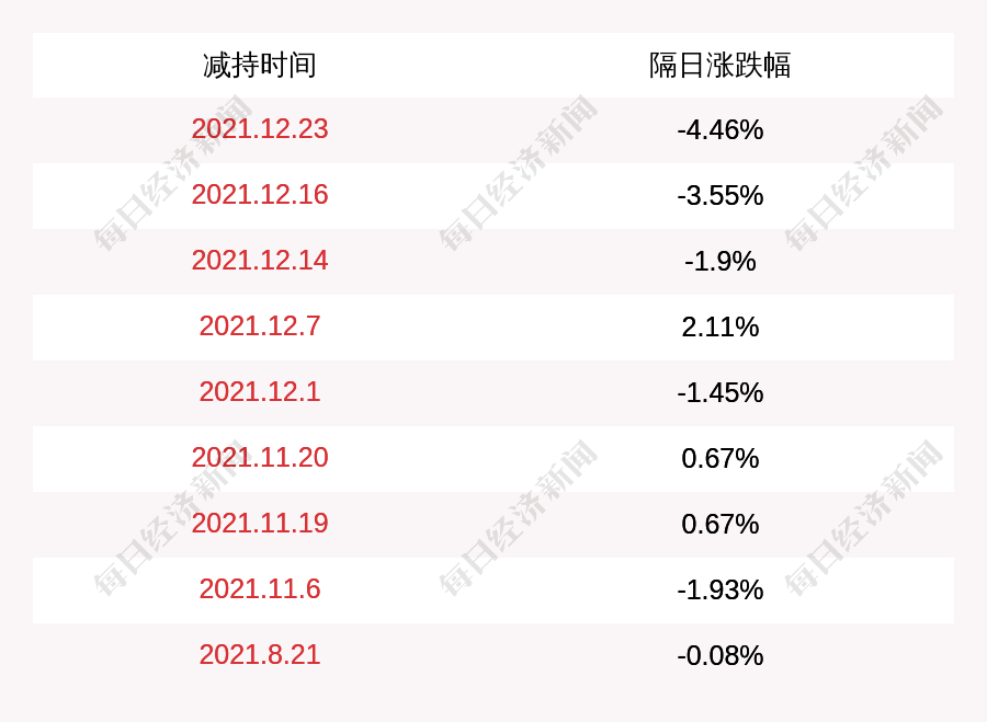2. 盟升电子上次发布减持公告是2021年12月23日,第二个交易日下跌4.46%,盟升电子近一年共发布10次减持类公告。
