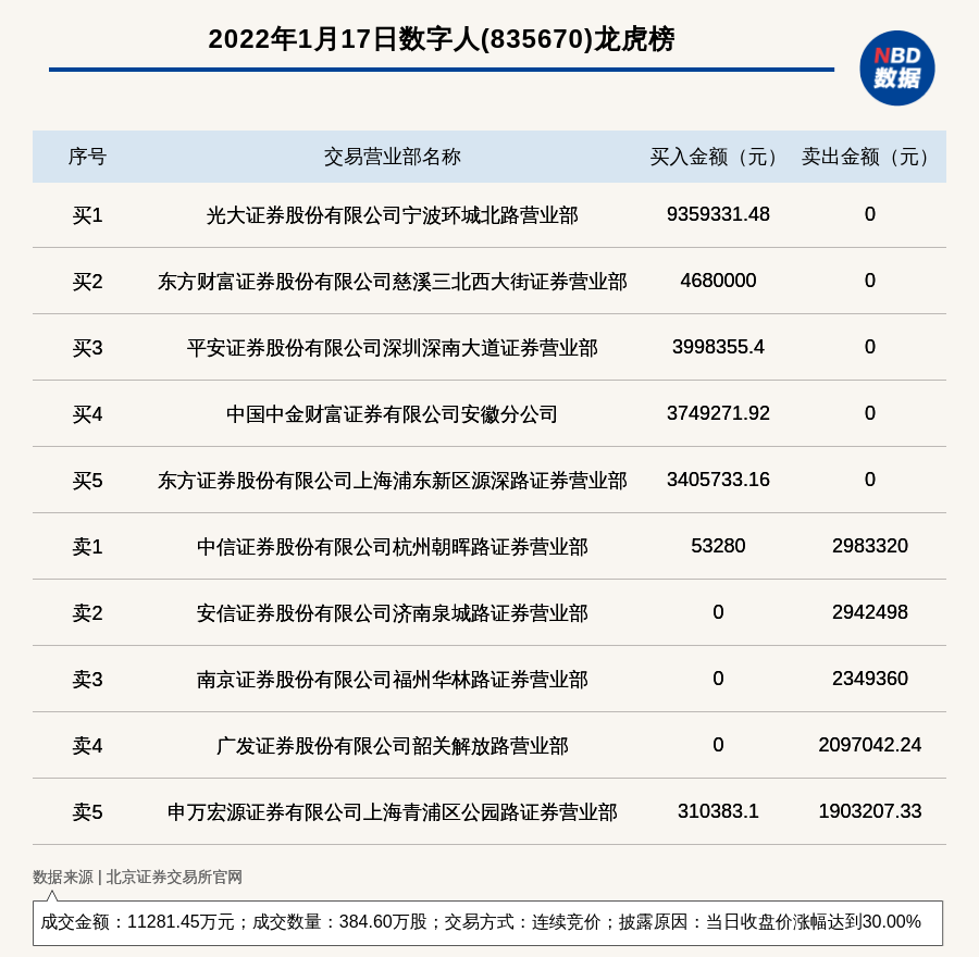 每经讯,2022年1月17日,北交所上市公司数字人(835670)登上龙虎榜,交易方式是连续竞价,披露原因是当日收盘价涨幅达到30.00%,成交数量384.60万股,成交金额11281.45万元。买一席位为光大证券股份有限公司宁波环城北路营业部,买入935.93万元;卖一席位为中信证券股份有限公司杭州朝晖路证券营业部,卖出298.33万元。