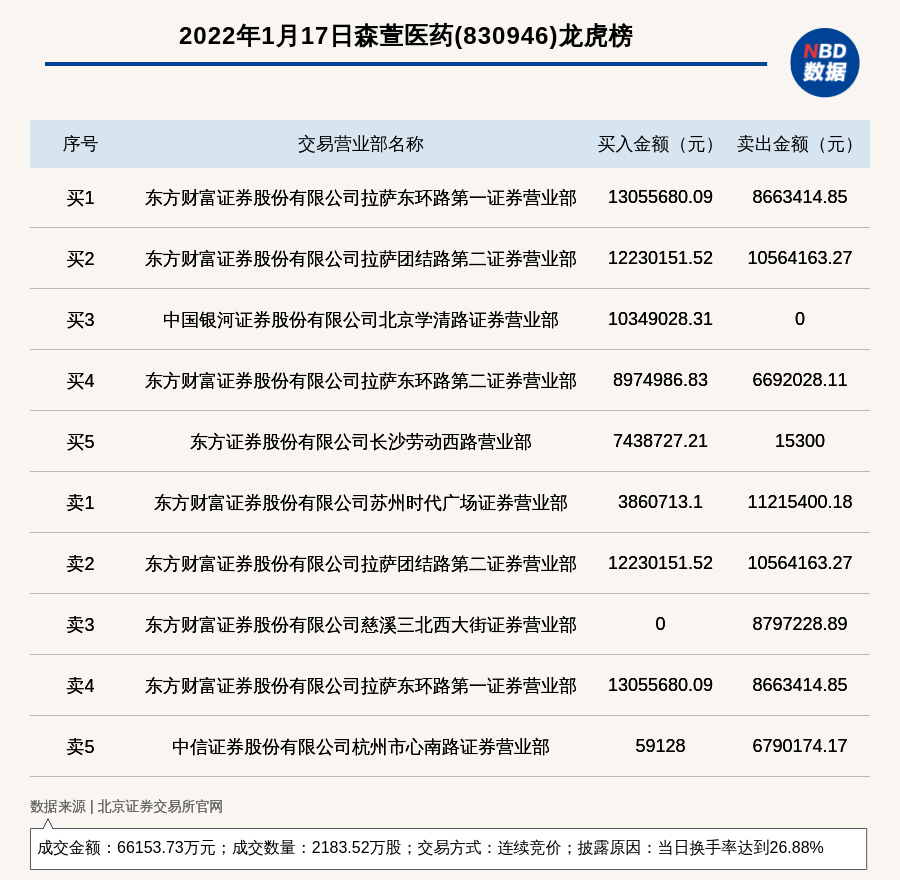 每经讯,2022年1月17日,北交所上市公司森萱医药(830946)登上龙虎榜,交易方式是连续竞价,披露原因是当日换手率达到26.88%,成交数量2183.52万股,成交金额66153.73万元。买一席位为东方财富证券股份有限公司拉萨东环路第一证券营业部,买入1305.57万元;卖一席位为东方财富证券股份有限公司苏州时代广场证券营业部,卖出1121.54万元。
