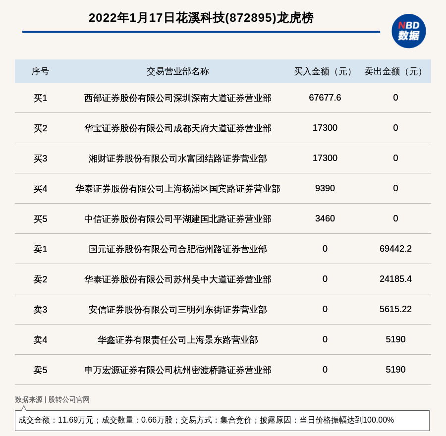 每经讯,2022年1月17日,新三板创新层公司花溪科技(872895)登上龙虎榜,交易方式是集合竞价,披露原因是当日价格振幅达到100.00%,成交数量0.66万股,成交金额11.69万元。买一席位为西部证券股份有限公司深圳深南大道证券营业部,买入6.77万元;卖一席位为国元证券股份有限公司合肥宿州路证券营业部,卖出6.94万元。