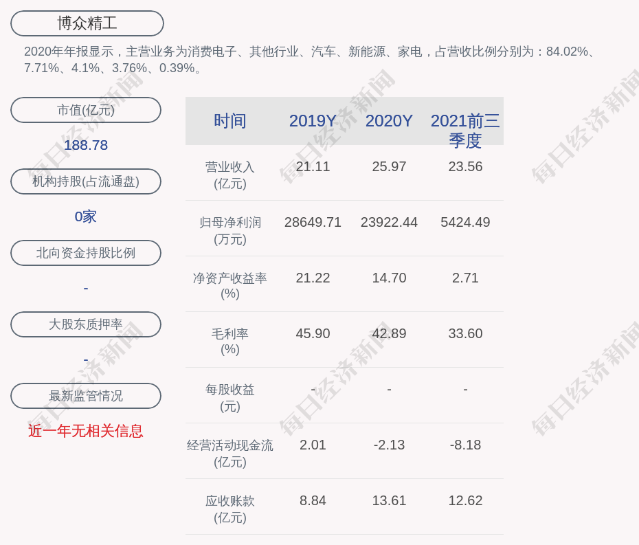 2020年年报显示,博众精工的主营业务为消费电子、其他行业、汽车、新能源、家电,占营收比例分别为:84.02%、7.71%、4.1%、3.76%、0.39%。