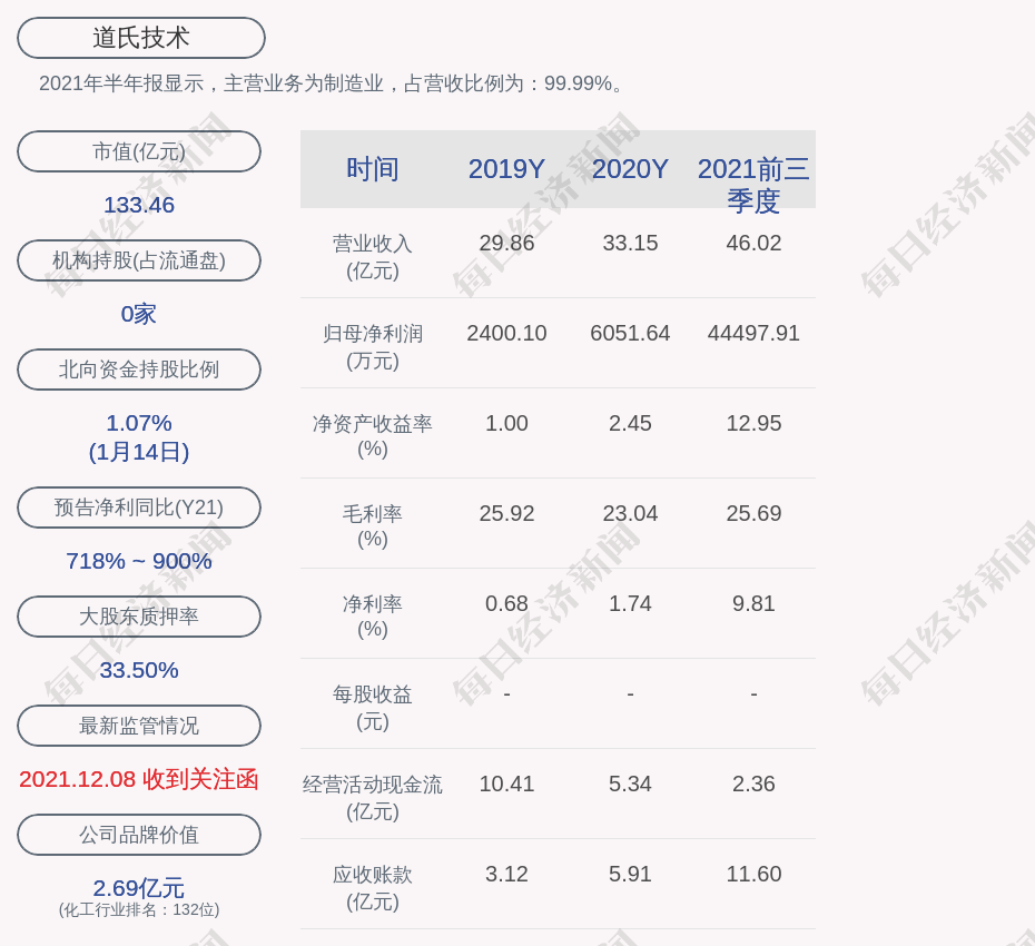 2021年半年报显示,道氏技术的主营业务为制造业,占营收比例为:99.99%。