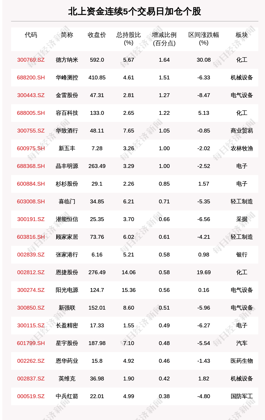 每经AI快讯,1月17日,北上资金连续5个交易日买入53个股。北上资金连续5个交易日加仓个股中,德方纳米(300769.SZ,收盘价:592.0元)增持比例增幅最大,5个交易日增持1.64个百分点,其他增持比例较大的个股包括华峰测控(688200.SH,收盘价:410.85元)、金雷股份(300443.SZ,收盘价:47.31元)、容百科技(688005.SH,收盘价:133.0元),分别增持1.51个百分点、1.27个百分点、1.22个百分点。