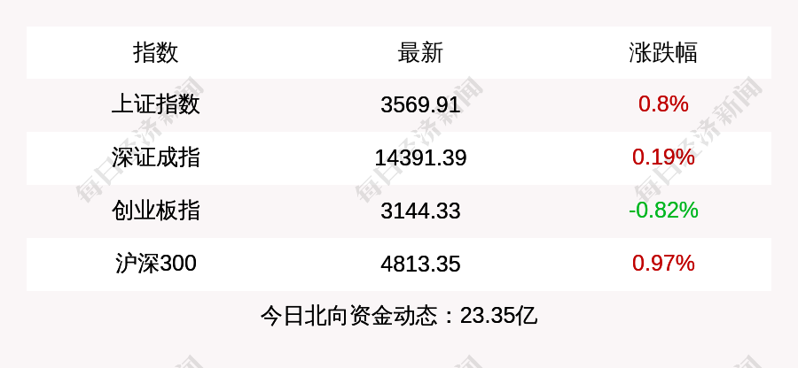 每经AI快讯:北京时间1月18日15:00,上证指数收盘上涨28.24点,涨幅为0.8%,报收3569.91点,成交额4708.32亿元;深证成指收盘上涨27.82点,涨幅为0.19%,报收14391.39点,成交额7250.87亿元;创业板指收盘下跌26.08点,跌幅为0.82%,报收3144.33点,成交额3222.69亿元;沪深300收盘上涨46.07点,涨幅为0.97%,报收4813.35点,成交额2827.49亿元。北上资金当日净流入23.35亿元。