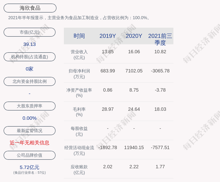 2021年半年报显示,海欣食品的主营业务为食品加工制造业,占营收比例为:100.0%。