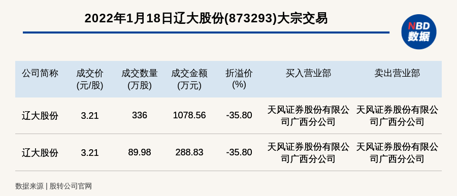 每经讯,2022年1月18日,新三板基础层公司辽大股份(873293)发生2笔大宗交易,总成交金额为1367.39万元,成交金额最高的一笔成交价3.21元/股,成交数量336万股,成交金额1078.56万元,折价35.8%。买入营业部是天风证券股份有限公司广西分公司,卖出营业部是天风证券股份有限公司广西分公司。
