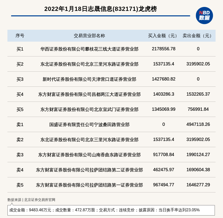 每经讯,2022年1月18日,北交所上市公司志晟信息(832171)登上龙虎榜,交易方式是连续竞价,披露原因是当日换手率达到23.05%,成交数量472.87万股,成交金额9483.46万元。买一席位为华西证券股份有限公司攀枝花三线大道证券营业部,买入217.86万元;卖一席位为国盛证券有限责任公司宁波桑田路营业部,卖出494.71万元。