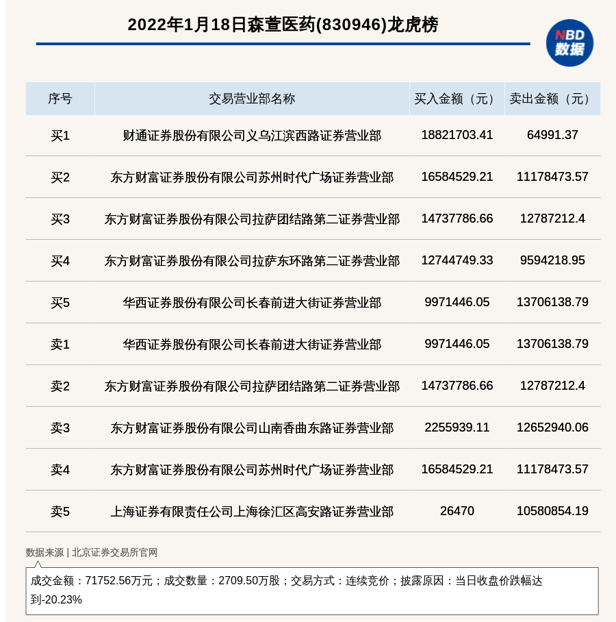 每经讯,2022年1月18日,北交所上市公司森萱医药(830946)登上龙虎榜,交易方式是连续竞价,披露原因是当日收盘价跌幅达到-20.23%,成交数量2709.50万股,成交金额71752.56万元。买一席位为财通证券股份有限公司义乌江滨西路证券营业部,买入1882.17万元;卖一席位为华西证券股份有限公司长春前进大街证券营业部,卖出1370.61万元。