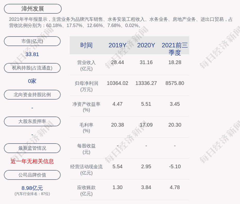 2021年半年报显示,漳州发展的主营业务为品牌汽车销售、水务安装工程收入、水务业务、房地产业务、进出口贸易,占营收比例分别为:60.18%、17.57%、12.66%、7.68%、0.02%。