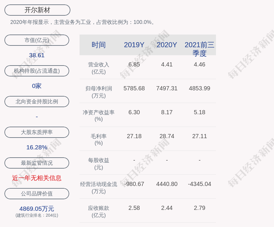 2020年年报显示,开尔新材的主营业务为工业,占营收比例为:100.0%。