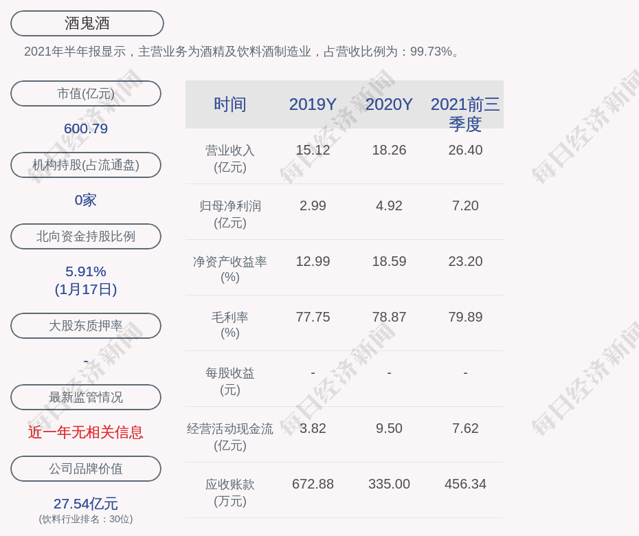 2021年半年报显示,酒鬼酒的主营业务为酒精及饮料酒制造业,占营收比例为:99.73%。