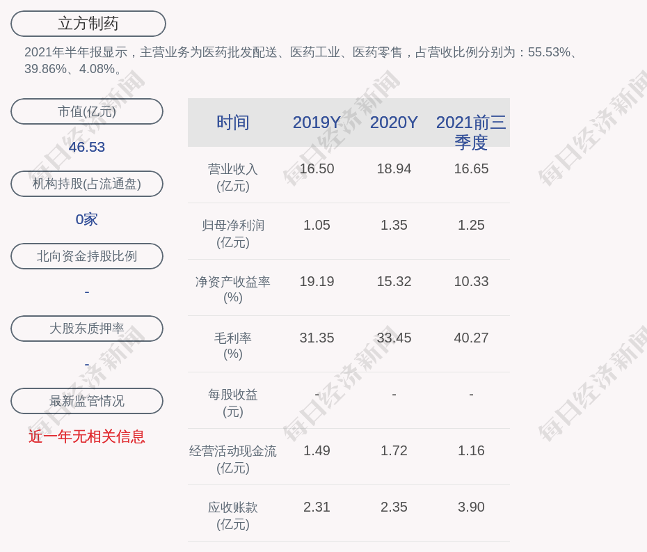 2021年半年报显示,立方制药的主营业务为医药批发配送、医药工业、医药零售,占营收比例分别为:55.53%、39.86%、4.08%。
