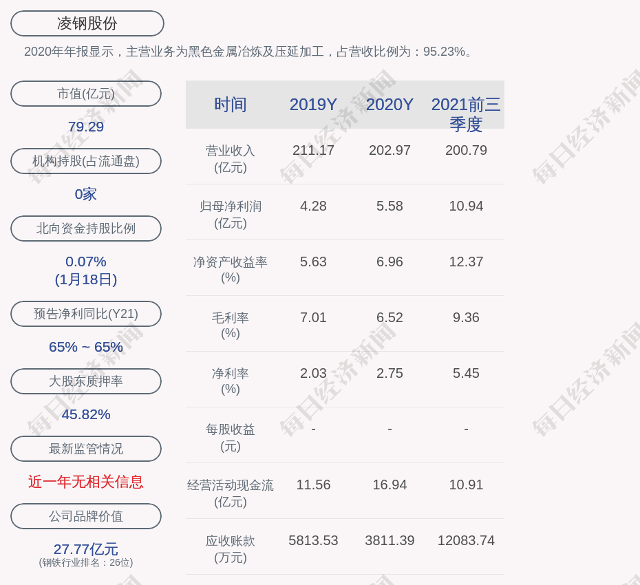 2020年年报显示,凌钢股份的主营业务为黑色金属冶炼及压延加工,占营收比例为:95.23%。