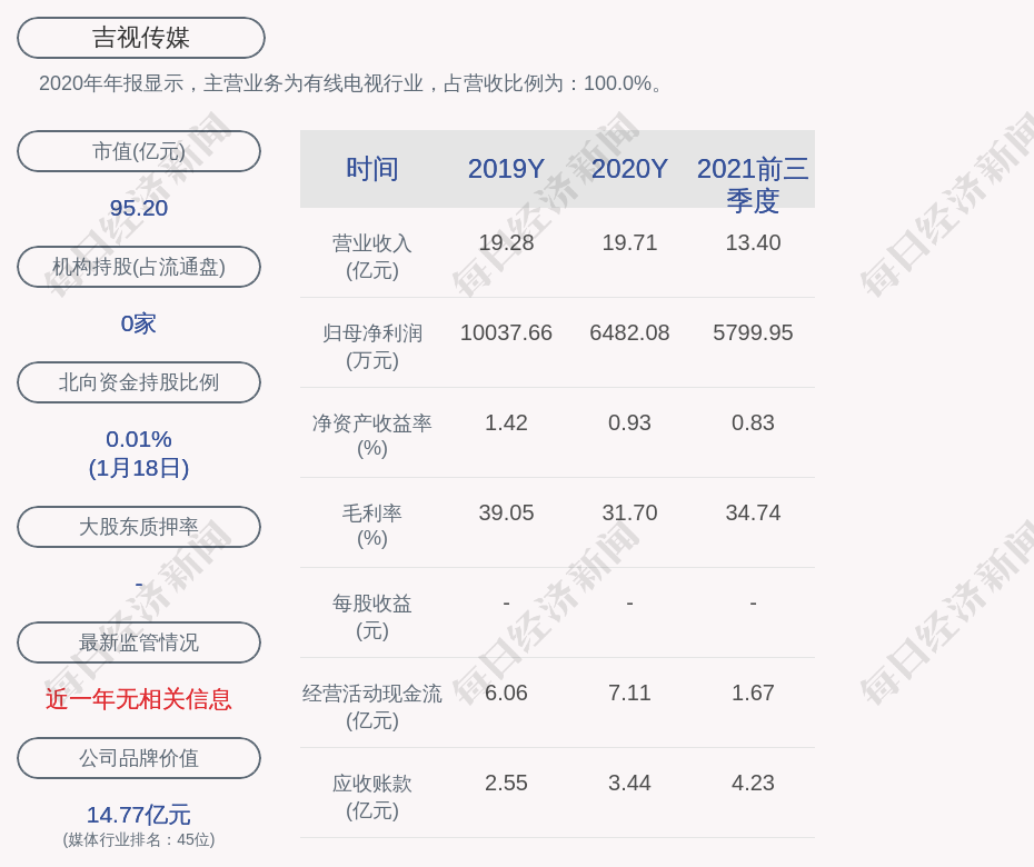 2020年年报显示,吉视传媒的主营业务为有线电视行业,占营收比例为:100.0%。