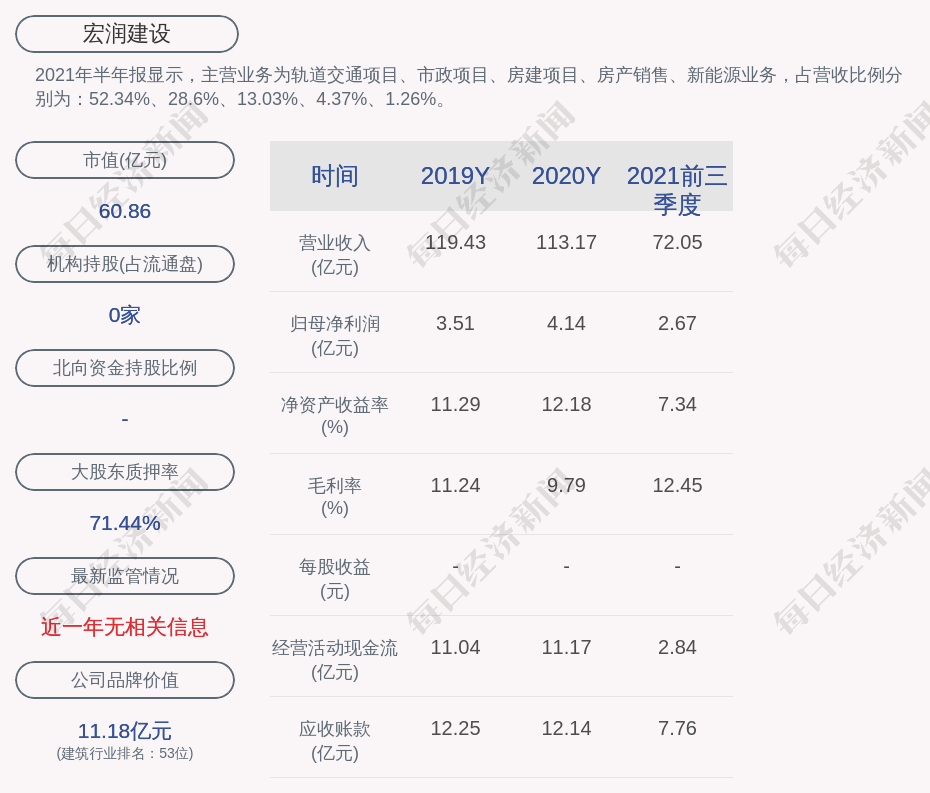 2021年半年报显示,宏润建设的主营业务为轨道交通项目、市政项目、房建项目、房产销售、新能源业务,占营收比例分别为:52.34%、28.6%、13.03%、4.37%、1.26%。