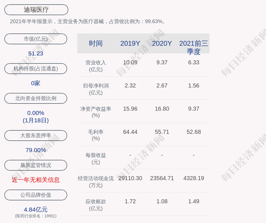 2021年半年报显示,迪瑞医疗的主营业务为医疗器械,占营收比例为:99.63%。