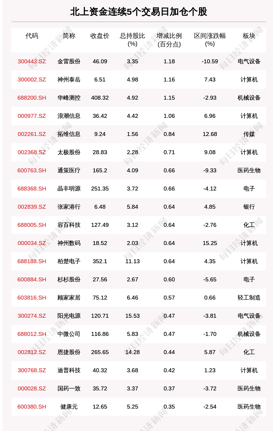 每经AI快讯,1月19日,北上资金连续5个交易日买入50个股。北上资金连续5个交易日加仓个股中,金雷股份(300443.SZ,收盘价:46.09元)增持比例增幅最大,5个交易日增持1.18个百分点,其他增持比例较大的个股包括神州泰岳(300002.SZ,收盘价:6.51元)、华峰测控(688200.SH,收盘价:408.32元)、浪潮信息(000977.SZ,收盘价:36.42元),分别增持1.16个百分点、1.15个百分点、1.06个百分点。