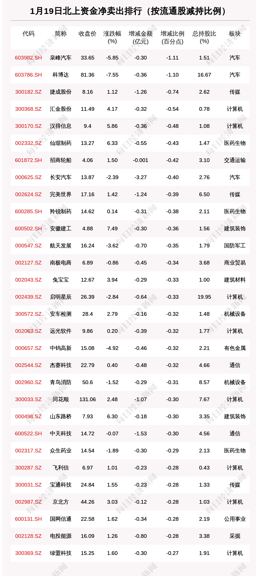 每经AI快讯,1月19日,北上资金净卖出的个股共有706只,北上资金减仓比例超1%的有579只。其中,泉峰汽车(603982.SH,收盘价:33.65元)减仓比例最为明显,最新持股比例1.51%,环比减少1.11个百分点。其他北上资金减仓比例较多的个股还包括科博达(603786.SH,收盘价:81.36元)、捷成股份(300182.SZ,收盘价:8.16元)、汇金股份(300368.SZ,收盘价:11.49元)。