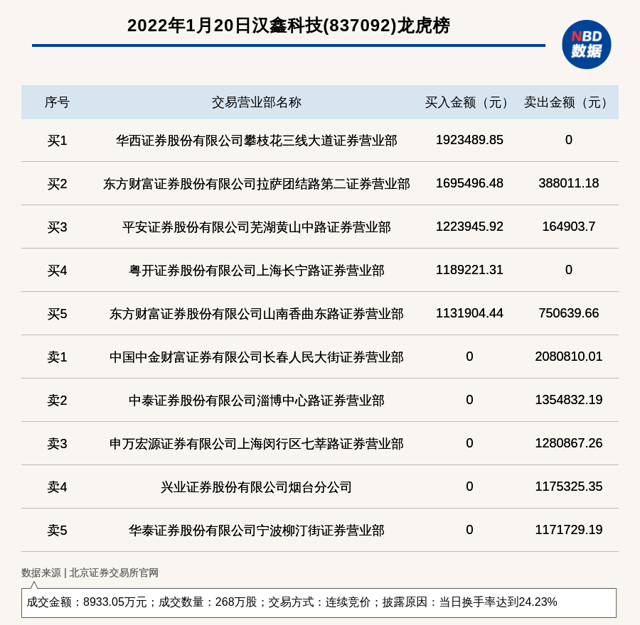 每经讯,2022年1月20日,北交所上市公司汉鑫科技(837092)登上龙虎榜,交易方式是连续竞价,披露原因是当日换手率达到24.23%,成交数量268万股,成交金额8933.05万元。买一席位为华西证券股份有限公司攀枝花三线大道证券营业部,买入192.35万元;卖一席位为中国中金财富证券有限公司长春人民大街证券营业部,卖出208.08万元。