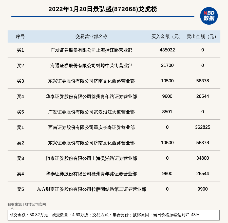 每经讯,2022年1月20日,新三板创新层公司景弘盛(872668)登上龙虎榜,交易方式是集合竞价,披露原因是当日价格振幅达到71.43%,成交数量4.63万股,成交金额50.82万元。买一席位为广发证券股份有限公司上海控江路营业部,买入43.50万元;卖一席位为西南证券股份有限公司重庆长寿证券营业部,卖出36.28万元。