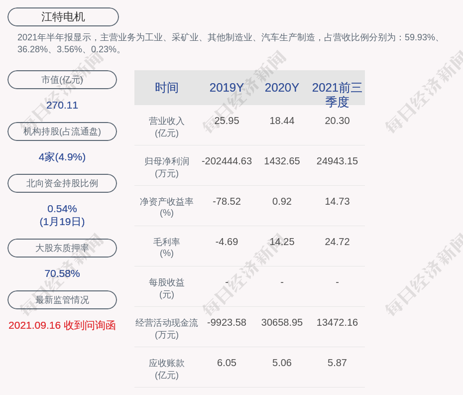 2021年半年报显示,江特电机的主营业务为工业、采矿业、其他制造业、汽车生产制造,占营收比例分别为:59.93%、36.28%、3.56%、0.23%。