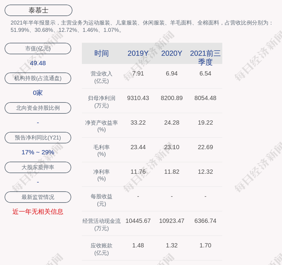 2021年半年报显示,泰慕士的主营业务为运动服装、儿童服装、休闲服装、羊毛面料、全棉面料,占营收比例分别为:51.99%、30.68%、12.72%、1.46%、1.07%。