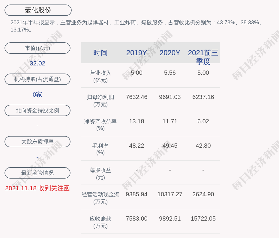 2021年半年报显示,壶化股份的主营业务为起爆器材、工业炸药、爆破服务,占营收比例分别为:43.73%、38.33%、13.17%。