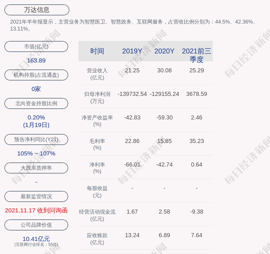 2021年半年报显示,万达信息的主营业务为智慧医卫、智慧政务、互联网服务,占营收比例分别为:44.5%、42.36%、13.11%。