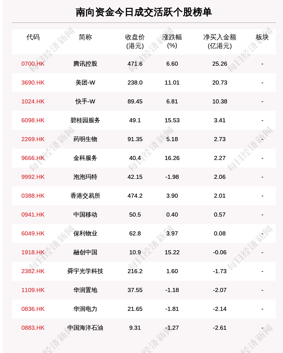 南向资金成交活跃个股榜单中,净买入个股共10只,金额最多的是腾讯控股(0700.HK,收盘价:471.6港元),净买入25.260亿港元;净卖出个股共5只,金额最多的是中国海洋石油(0883.HK,收盘价:9.31港元),净卖出2.609亿港元。