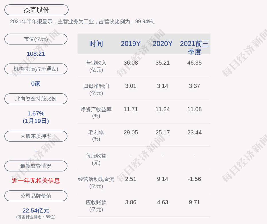 2021年半年报显示,杰克股份的主营业务为工业,占营收比例为:99.94%。
