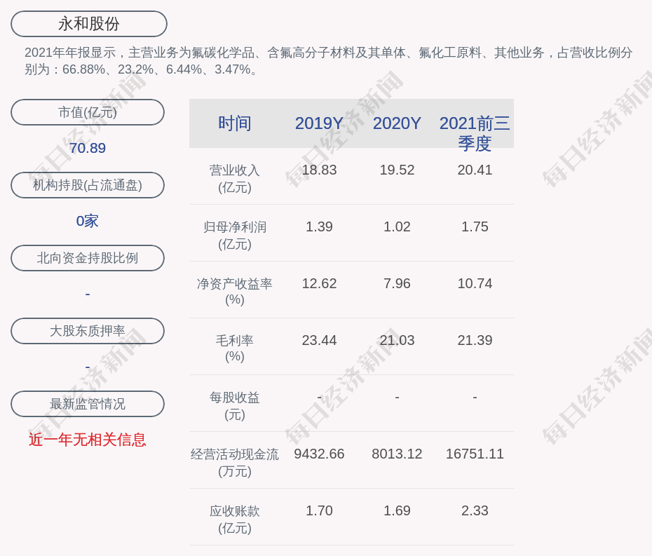 2021年年报显示,永和股份的主营业务为氟碳化学品、含氟高分子材料及其单体、氟化工原料、其他业务,占营收比例分别为:66.88%、23.2%、6.44%、3.47%。