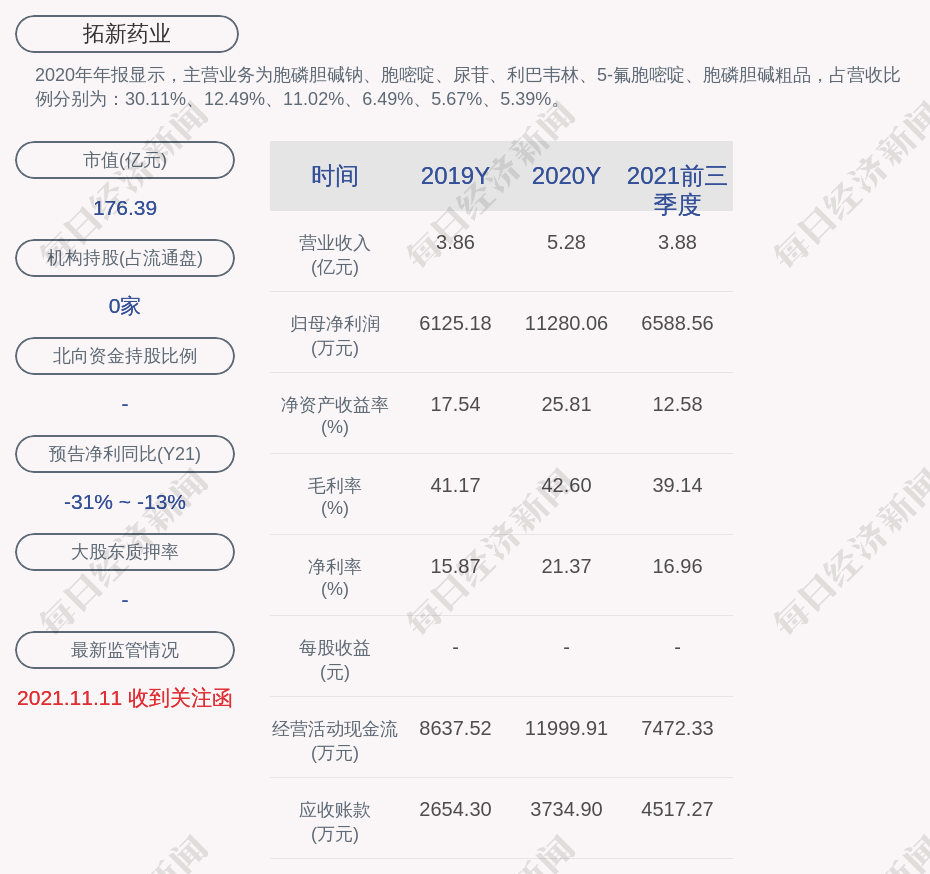 2020年年报显示,拓新药业的主营业务为胞磷胆碱钠、胞嘧啶、尿苷、利巴韦林、5-氟胞嘧啶、胞磷胆碱粗品,占营收比例分别为:30.11%、12.49%、11.02%、6.49%、5.67%、5.39%。