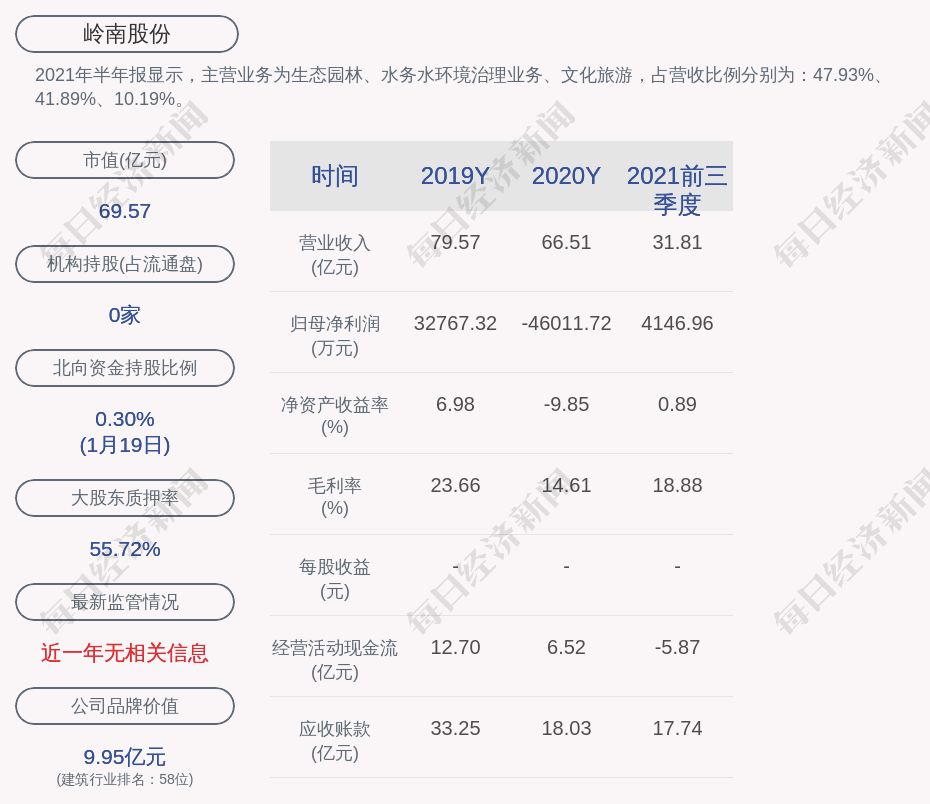 2021年半年报显示,岭南股份的主营业务为生态园林、水务水环境治理业务、文化旅游,占营收比例分别为:47.93%、41.89%、10.19%。