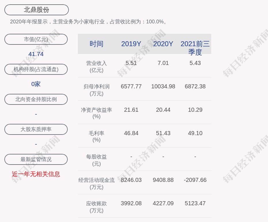 2020年年报显示,北鼎股份的主营业务为小家电行业,占营收比例为:100.0%。