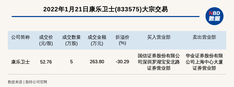每经讯,2022年1月21日,新三板创新层公司康乐卫士(833575)发生一笔大宗交易,成交价52.76元/股,成交数量5万股,成交金额263.80万元,折价30.29%。买入营业部是国信证券股份有限公司深圳罗湖宝安北路证券营业部,卖出营业部是华金证券股份有限公司上海中心大厦证券营业部。