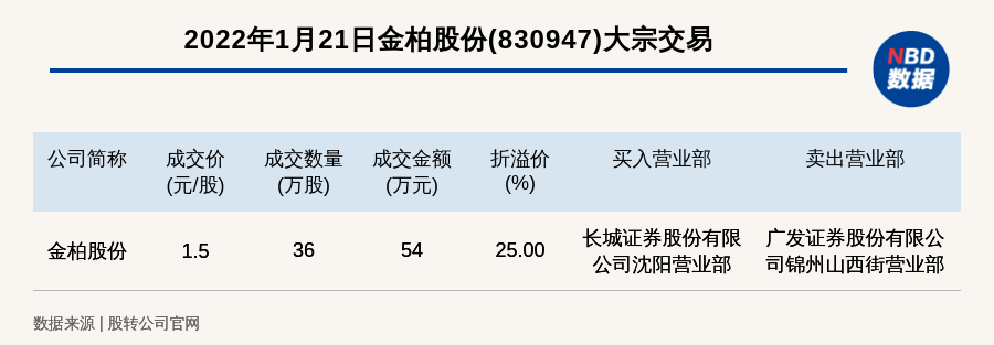 每经讯,2022年1月21日,新三板基础层公司金柏股份(830947)发生一笔大宗交易,成交价1.5元/股,成交数量36万股,成交金额54万元,溢价25%。买入营业部是长城证券股份有限公司沈阳营业部,卖出营业部是广发证券股份有限公司锦州山西街营业部。