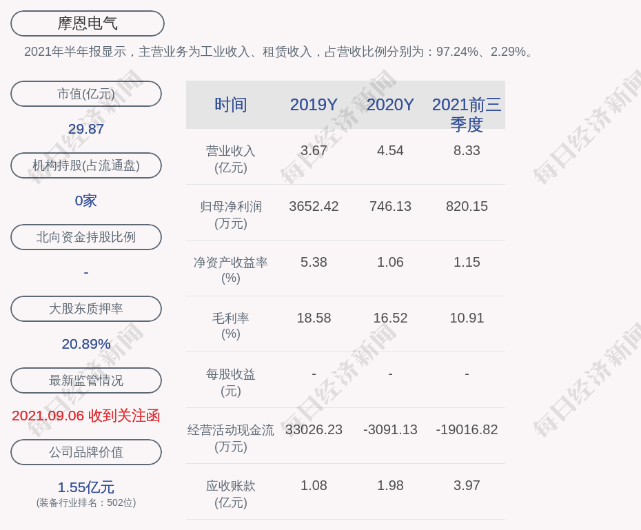 2021年半年报显示,摩恩电气的主营业务为工业收入、租赁收入,占营收比例分别为:97.24%、2.29%。