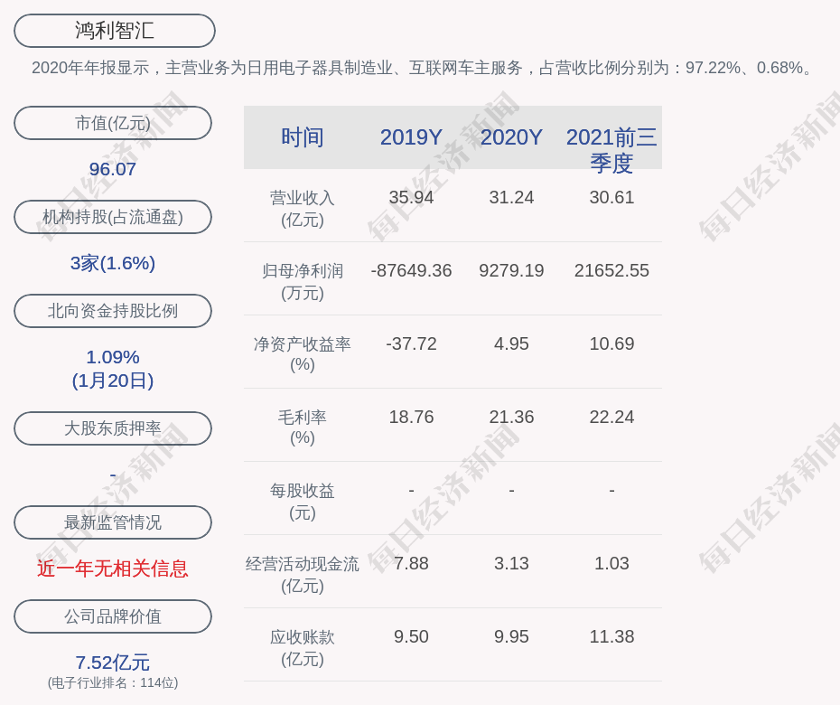 2020年年报显示,鸿利智汇的主营业务为日用电子器具制造业、互联网车主服务,占营收比例分别为:97.22%、0.68%。