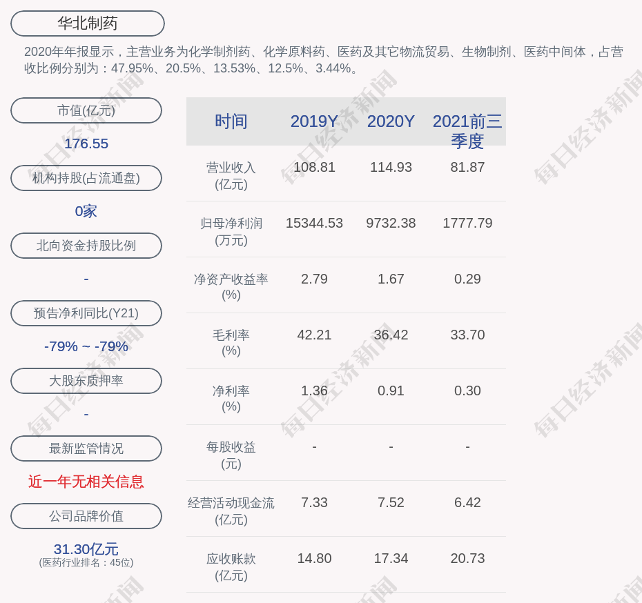 2. 华北制药在近3个交易日下跌20.66%,所属医药生物板块同期下跌5.82%,上证指数同期下跌1.33%。