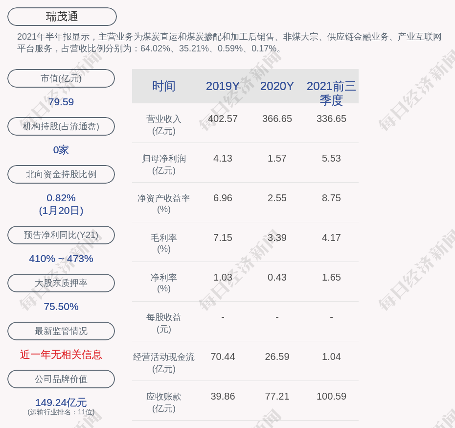 2021年半年报显示,瑞茂通的主营业务为煤炭直运和煤炭掺配和加工后销售、非煤大宗、供应链金融业务、产业互联网平台服务,占营收比例分别为:64.02%、35.21%、0.59%、0.17%。